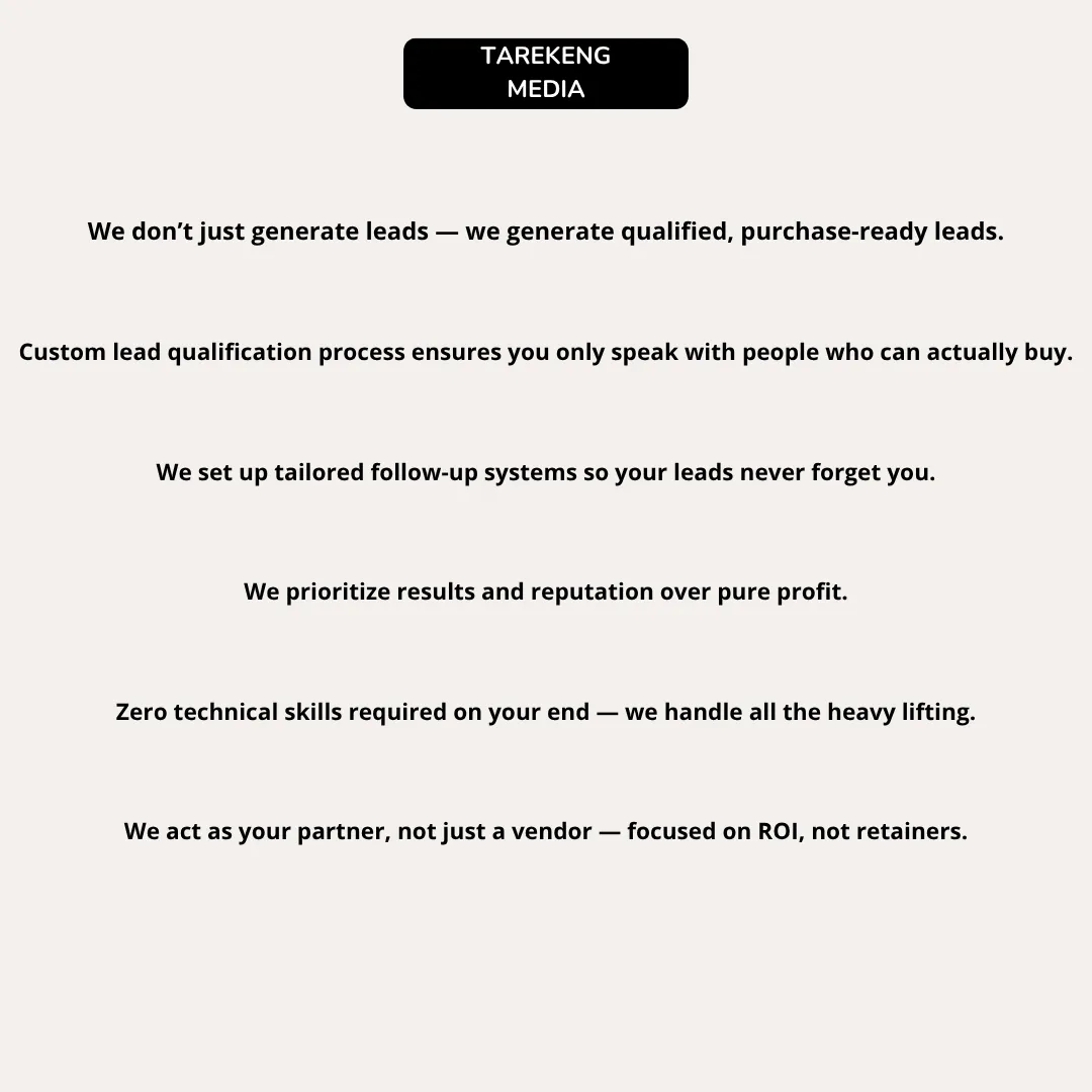 This ensures that the leads we deliver are genuinely interested and purchase-ready. From there, we guide them into a tailored follow-up system that nurtures each prospect, keeping your business top of mind and maximizing the chances that every lead engages—especially those who haven’t yet booked an appointment with you.