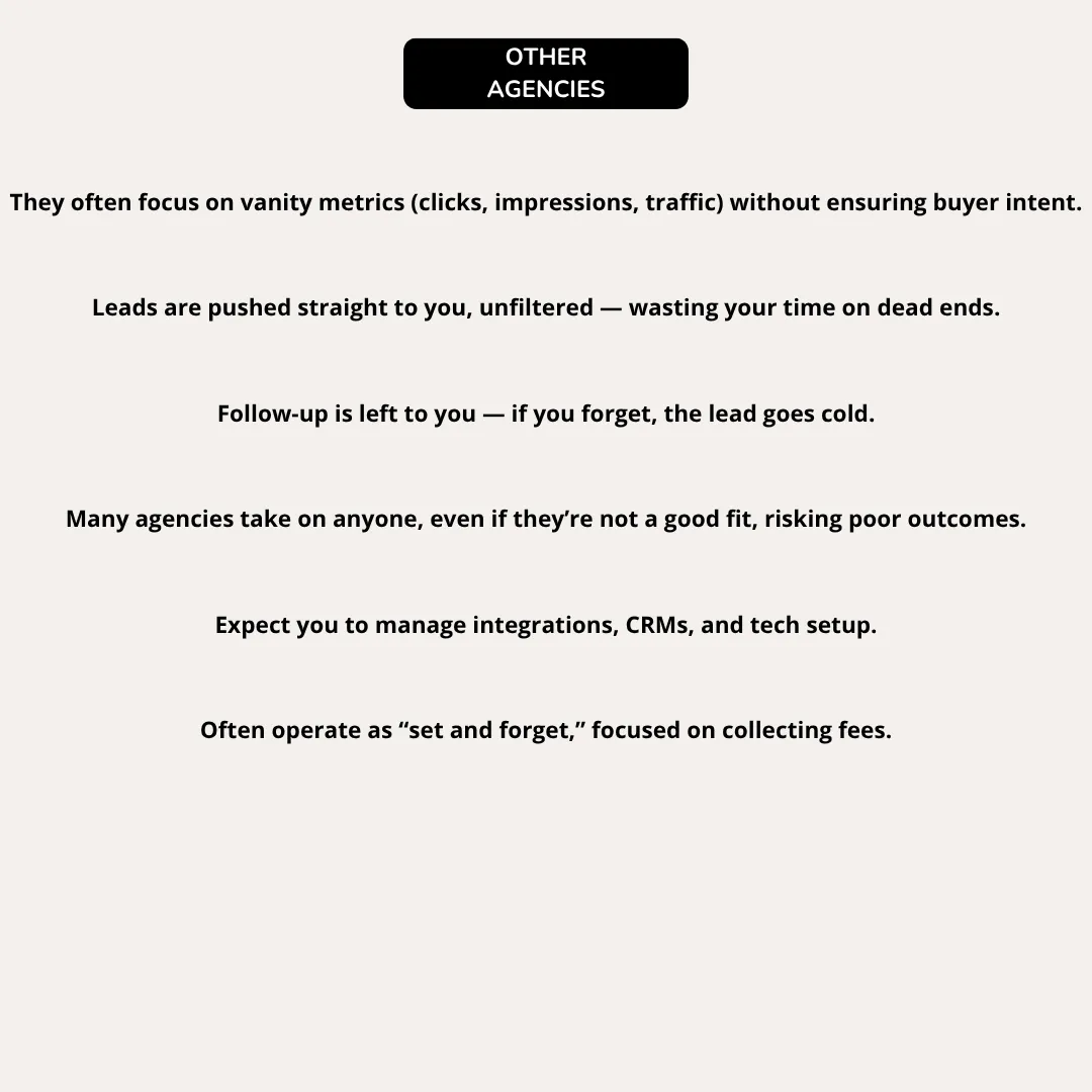 This ensures that the leads we deliver are genuinely interested and purchase-ready. From there, we guide them into a tailored follow-up system that nurtures each prospect, keeping your business top of mind and maximizing the chances that every lead engages—especially those who haven’t yet booked an appointment with you.